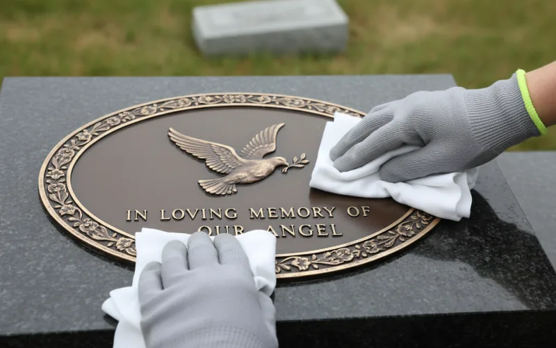Bronze needs extra attention since oxidation and peeling of clear coats are common. The best way to clean a tombstone in bronze is with mild soap and water, followed by drying and waxing to protect the finish. Cemeteries can also keep a bronze grave marker cleaning kit handy to handle stubborn stains or patina safely.