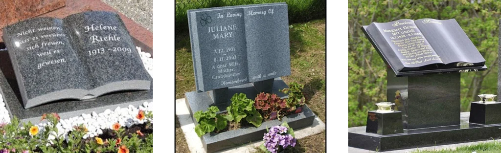Book headstones are a great way to pay tribute to somebody who had a great interest in literature reading and learning. They are crafted in the form of both open and closed books signifying different meanings. An open-book tombstone signifies the continuity of life beyond death whereas a closed book signifies the end of this well-lived life. The design of the headstone includes the spine of the book and its pages with details engraved on it like name, age, etc. It is typically made of granite and marble, due to their durability and easy-to-do engravings.